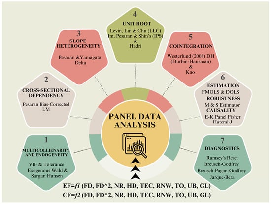 This study contributes to the existing literature in four ways: (1) It provides new evidence by investigating whether there is an inverted U-shaped connection between financial development and environmental degradation. G-10 countries represent financially developed countries with strong capital markets and banking systems. It is therefore important to assess whether such investments offset the negative impact of FD on environmental degradation. (2) It analyzes the connection between natural resource rents and environmental degradation in industrialized countries and evaluates it within the framework of the resource curse hypothesis in developed economies. The natural resource curse hypothesis argues that economies overly dependent on natural resource rents may ignore industrialization and economic diversification and relegate environmental protection policies to the background []. In this context, it is important to assess the impact of natural resource wealth on efforts to prevent environmental degradation. (3) This study has broad policy implications for environmental sustainability and development by including human development and technological innovation in the model. Moreover, this study takes a multifaceted view of environmental sustainability and uses ecological and carbon footprint indicators of environmental pollution. (4) This study employs FMOLS and DOLS to obtain reliable and appropriate regression analysis results. Additionally, the findings are supported by symmetric and asymmetric causality tests. This study offers broad explorations for government policy elaboration for sustainable growth in this context.