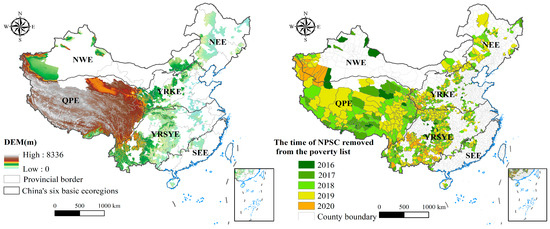 Geographical location of NPSCs and timeline of poverty alleviation. QPE, SEE, NWE, YRSYE, NEE, and YRKE represent Qinghai–Tibet Plateau Ecoregion, Southeast Ecoregion, Northwest Ecoregion, Yangtze River and Sichuan–Yunnan Key Ecoregion, Northeast Ecoregion, and Yellow River Key Ecoregion, respectively.