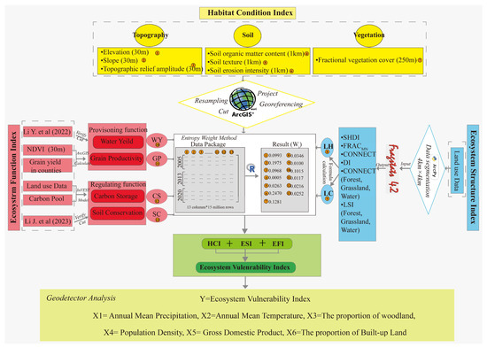 Ecosystem vulnerability was measured from three aspects, habitat condition (HC), ecosystem structure (ES), and ecosystem function (EF), by integrating multiple ecosystem characteristics. Habitat conditions are essential for the proper functioning of regional ecosystems and present the eco-geographical environment characterized by topography, vegetation, and soil [61]. As significant characteristics of ecosystems, this study primarily illustrates the structure and function of ecosystems at the landscape scale, including a range of landscape pattern indicators and ecosystem services [62,63]. Overall, regions characterized by superior habitat conditions, a complex ecosystem structure, and a robust ecosystem function capacity exhibit greater stability and resilience, which ultimately reduces ecosystem vulnerability [64]. The ecosystem vulnerability index (EVI) was calculated as follows: