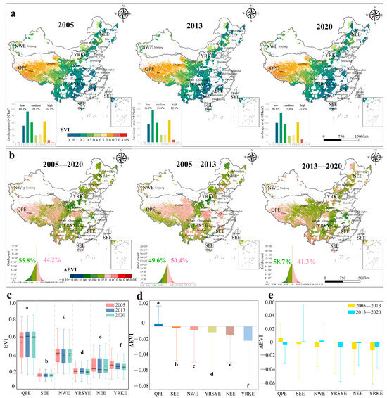 Distribution of the ecosystem vulnerability index (EVI) and the ΔEVI for the NPSCs. (a) EVI in 2005, 2013, and 2020; (b) ΔEVI in 2005–2020, 2005–2013, and 2013–2020. (a) The bar charts shown in the lower left corner depict the area of the EVI. (b) The pixel distribution plots in the lower left corner represent the number of pixels for ΔEVI. (c) EVI values for different ecoregions in 2005, 2013, and 2020, (d) ΔEVI values for different ecoregions during 2005–2020, and (e) ΔEVI values for different ecoregions during 2005–2013 and 2013–2020. (c) The boxes display the median value and lower 25% and upper 75% percentiles, the dots represent the mean value, and the whiskers are extended to the limit of the 1.5-fold interquartile range (IQR). (d,e) The bar heights show the mean value, and error bars show one standard deviation. The significance of the differences in the EVI and ΔEVI among ecoregions was tested using the Welchi and Tamhena test, and the letters in each bar show the results of multiple comparisons of the mean EVI and ΔEVI with p < 0.05. (c–e) QPE, SEE, NWE, YRSYE, NEE, and YRKE represent Qinghai–Tibet Plateau Ecoregion, Southeast Ecoregion, Northwest Ecoregion, Yangtze River and Sichuan–Yunnan Key Ecoregion, Northeast Ecoregion, and Yellow River Key Ecoregion, respectively.
