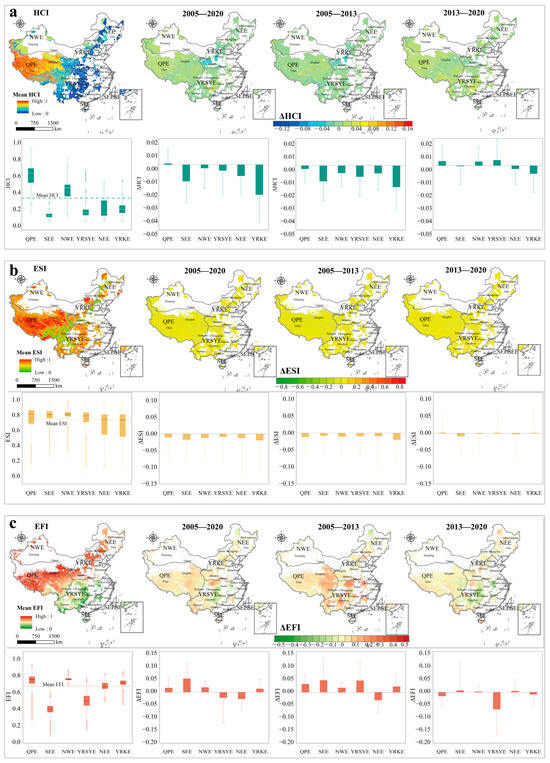 From a geographical perspective, the ecoregions demonstrated various predominant modes of change before and after 2013. In the QPE, the HCIdownESIdownEFIdown mode experienced the most substantial growth in area proportion, increasing from 5.09% (pre-2013) to 21.6% (post-2013), which was largely transferred from HCIupESIdownEFIup and HCIdownESIdownEFIup. For the YRSYE, the area of the HCIupESIdownEFIdown mode increased from 2.83% to 22.31% due to the decrease in HCIdownESIdownEFIup and HCIdownESIupEFIup, indicating a trade-off between the HCI and EFI in this region. As for the YRKE, during 2013–2020, the HCIdownESIupEFIdown mode’s area expanded most significantly, rising from 10.8% to 18.8%, largely due to the transition from HCIdownESIdownEFIup to HCIdown ESIupEFIup.