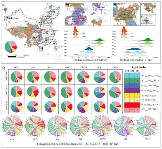 Spatial distributions and composition proportions of eight ecosystem vulnerability modes for the NPSCs during 2005–2020 (the upper row) and those for the six ecoregions in different periods (the below row). (a) The HCI, ESI, and EFI constitute the ecosystem vulnerability index (EVI). The arrows labeled “up” and “down” represent an increasing and decreasing trend, respectively. Four main hot spots in the areas where the EVI most obviously decreased and increased were selected to show the changes in each component of the EVI. Cold spots, D1, included 41 poverty-stricken counties from the Guizhou, Chongqing, Hunan, Hubei, and Anhui provinces, and the hot spots were I1 in the Sichuan, Shaanxi, and Henan provinces (22 poverty-stricken counties), I2 in the Yunnan provinces (3 poverty-stricken counties), and I3 in the Hainan provinces (4 poverty-stricken counties). The ridge plots display the normalized values of the HCIvul, ESIvul, and EFIvul for hot spots in 2005, 2013, and 2020, and the percentages of increase or decrease for each of these values are used to reflect their contributions to the changes in the EVI. (b) Pie charts depict the proportional areas of eight ecosystem vulnerability modes across various time periods in the six NPSC ecoregions.
