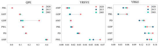 The contribution rate q for the QPE, YRSYE, and YRKE from 2005 to 2020. Note: q ϵ [0, 1]. QPE, YRSYE, and YRKE represent Qinghai–Tibet Plateau Ecoregion, Yangtze River and Sichuan–Yunnan Key Ecoregion, and Yellow River Key Ecoregion, respectively. PBL, the proportion of built-up land. AMT, mean annual temperature. GDP, gross domestic product. PWL, the proportion of woodland. PD, population density. AMP, annual mean precipitation.