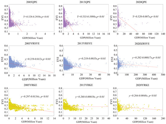 Correlation analysis between EVI and GDP for QPE, YRSYE, and YRKE from 2005 to 2020. QPE, YRSYE, and YRKE represent Qinghai–Tibet Plateau Ecoregion, Yangtze River and Sichuan–Yunnan Key Ecoregion, and Yellow River Key Ecoregion, respectively.