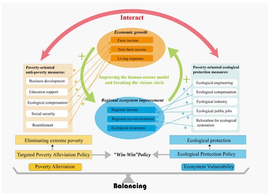 Overall, the Chinese government has achieved targets for poverty alleviation and ecological protection, implementing a “win–win” policy (Figure 8). This has effectively broken the vicious cycle of poverty and ecosystem vulnerability in areas that account for 46% of China’s landmass [95]. On the one hand, targeted poverty alleviation has addressed individual poverty issues through five unconventional strategies (e.g., business development, education support, social security, resettlement, and ecological compensation) [109], thereby promoting economic growth among the impoverished population. On the other hand, poverty-oriented ecological protection policies have tackled regional ecological problems and have contributed to solving regional poverty issues. The ecological poverty alleviation approach encompasses five primary strategies: participation in ecological engineering projects, the implementation of ecological compensation policies, the establishment of public welfare ecological positions, the promotion of eco-friendly industries, and the implementation of ecological relocation programs [110,111,112]. China has demonstrated significant success in these practices, including employing over 1.1 million impoverished individuals as forest rangers and resettling 9.6 million impoverished households through ecological relocation [47]. This demonstrates that ecological protection projects should not only provide ecological benefits but also bring long-term economic benefits to residents, a method that can also promote the implementation of the United Nations Sustainable Development Goals, such as protecting ecosystems and eradicating poverty [113].