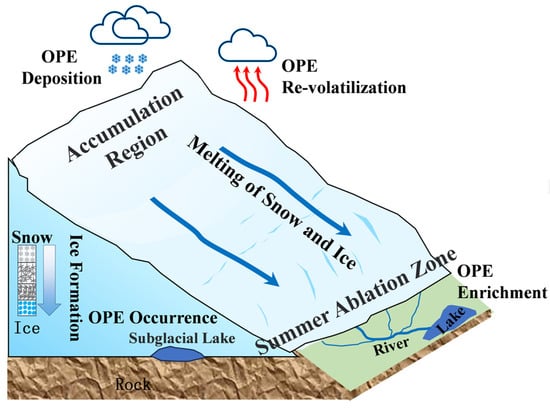 - Impact of OPE Release from Snow and Ice on Downstream Ecosystems. Snow and ice in the cryosphere serve as crucial enrichment zones for OPEs transported from lower latitudes via long-range atmospheric transport. These regions also act as secondary emission sources of OPEs, particularly under the influence of climate warming. However, the full impact of OPEs on the cryosphere ecosystem and human health remains unclear. Further research is needed to investigate the consequences of OPEs on ecosystems exposed to enriched environments, including during the snow and ice melting season. Specific attention should be given to the release of OPEs into meltwater and their subsequent enrichment in downstream rivers and lakes. Quantitative studies are needed to assess the risks posed by OPEs to downstream ecosystems and determine whether the accumulation of OPEs in these ecosystems could elevate toxicological risks.