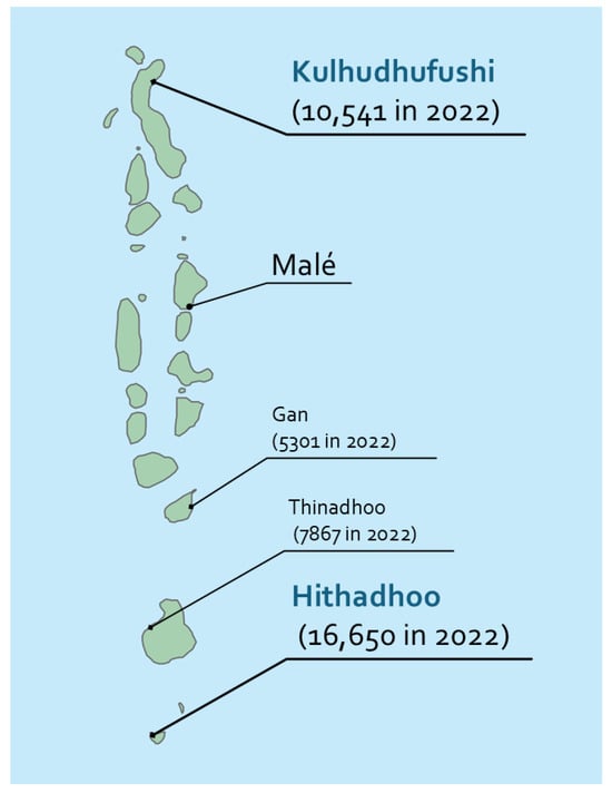 - Base Map: Map of the Republic of Maldives by Ziansh, Wikimedia Commons. 2024. Available online: https://commons.wikimedia.org/wiki/File:Maldives_location_map.svg (accessed on 4 December 2024).