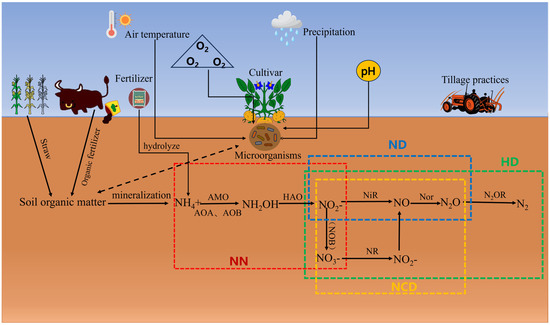Nitrous oxide (N2O), a major global greenhouse gas, contributes approximately 5% to the overall greenhouse effect and has a warming potential that is over 300 times greater than that of carbon dioxide (CO2) [1,2]. Between 80% and 90% of the N2O generated by agricultural activities is released into the atmosphere [3], with global emissions from farmland soils estimated to be between 1.2 and 4.2 teragrams (TG). As the global population continues to grow and agricultural production intensifies, N2O emissions from agricultural practices are expected to further rise [4,5]. This poses a serious challenge to achieving the United Nations’ Sustainable Development Goals (SDGs). Nitrification and denitrification processes in soil are the primary pathways through which N2O is released from agricultural lands [6,7]. As shown in Figure 1, the N2O produced by these two processes accounts for 90% of all atmospheric N2O [8]. The nitrification process carried out by nitrifying bacteria is categorized into two stages: ammonia oxidation and nitrite oxidation [9]. The ammonia oxidation process occurs in the presence of oxygen, where NH4+ is converted to NH2OH by ammonia monooxygenase (AMO), followed by the catalysis of NH2OH to NO2− through hydroxyline dehydrogenase (HAO). The microorganisms involved in this process include ammonia-oxidizing bacteria (AOB) and ammonia-oxidizing archaea (AOA) [10]. The nitrite oxidation process serves as a subsequent step, further oxidizing NO2− to NO3−, with nitrite-oxidizing bacteria (NOB) facilitating this transformation [11]. The nitrifying process (NCD), which involves coupling the nitrification reactions, refers to a reduction in the NO2− or NO3− generated by nitrification, ultimately producing N2O and N2 under the influence of nitrifying bacteria [12]. The nitrification process relates to the conversion of nitrite during ammonia oxidation, leading to N2O production through the action of nitrite reductase (Nir) and nitric oxide reductase (Nor) [13]. Under anaerobic or low-oxygen conditions, heterotrophic nitrifying bacteria can reduce nitrate and nitrite in the environment to N2O, which is subsequently converted to N2 with the aid of nitric oxide synthase (Nos Z). This process is referred to as heterotrophic denitrification (HD) and is typically associated with N2O production in soil [14]. These reactions can occur simultaneously; however, they are primarily influenced by factors such as soil moisture, temperature, pH, carbon-to-nitrogen ratios, and the presence of soil microorganisms [15,16,17,18]. Various environmental factors differ in their regulatory mechanisms and their degree of influence on the nitrification and denitrification pathways of N2O emissions from farmland soils.
