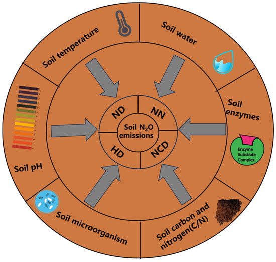 Effect of soil environmental factors on N2O emissions. Note: NN, nitrification by nitrifying bacteria; ND, denitrification by nitrifying bacteria; NCD, denitrification coupled to nitrification reactions; HD, heterotrophic denitrification.
