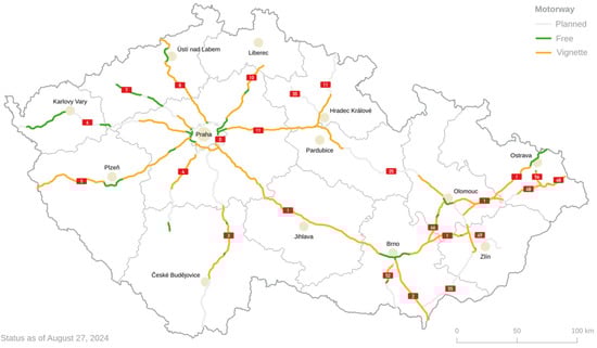 - Hudec, S. Motorways in the Czech Republic; Czech Motorways: Prague, Czech Republic, 2024; Available online: https://www.ceskedalnice.cz/wp-content/uploads/zpoplatnene-velka.png (accessed on 3 December 2024).