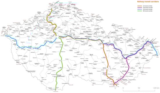 The TEN-T railway transport network currently includes four transit corridors in the Czech Republic (see Figure 2). A further 839 km of high-speed lines should be in operation by 2050 [].