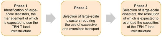 The following section of the article defines large-scale disasters resulting in the above-standard use of the TEN-T land infrastructure. In this context, above-standard use is considered to be the movement of excessive or oversized transport [] or overloading of the TEN-T land infrastructure capacities. The selection procedure for these disasters was divided into three phases (see Figure 3), which consider key criteria (i.e., excessiveness and over-dimensioning of equipment and infrastructure capacity) determining the above-standard use of TEN-T land infrastructure in managing large-scale disasters.