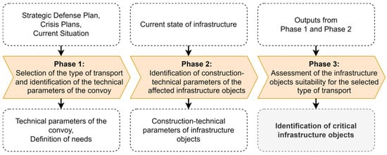 The outputs from these tools provide relevant information, but do not reflect the criticality of infrastructure objects in the context of their use for excessive and oversized transport. For this reason, a specific procedure was created, the output of which is an assessment of the suitability of infrastructure objects for these types of transport. The proposed identification procedure includes three phases (see Figure 4), which determine activities for assessing data that are the necessary basis for comparing the technical parameters of the convoy and the construction and technical parameters of the infrastructure. Within each phase, the inputs and outputs necessary for the process and the methods that are appropriate to use within a given phase are defined.