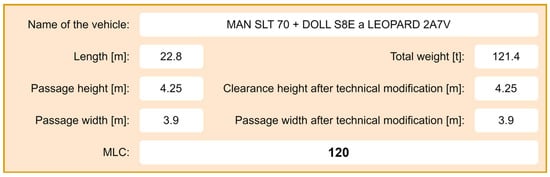 The starting point of this phase is the definition of the assessor’s needs, which result from defence and crisis plans. Based on these needs, it is first necessary to select the type of transport on the basis of which a specific convoy variant will be defined. For this convoy variant, the main technical parameters are then identified, which means the maximum passing widths and heights of all vehicles and vehicle combinations in the convoy and also the classification of all vehicles and vehicle combinations into MLC categories according to STANAG 2021 []. An example of the identification of technical parameters for one vehicle combination is presented in Figure 5.