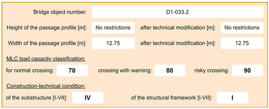 This phase of the process involves selecting the affected infrastructure objects and identifying their construction-technical parameters that affect the capacity of the transport network. An example of identifying construction-technical parameters for a specific bridge structure is presented in Figure 7.