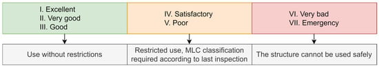 Based on the information from the bridge sheet and regular checks, it is possible to determine the construction-technical condition of the substructure and structural framework of the bridge structure. According to the assessment results, the construction-technical condition of bridge structures is classified into seven levels (see Figure 8).