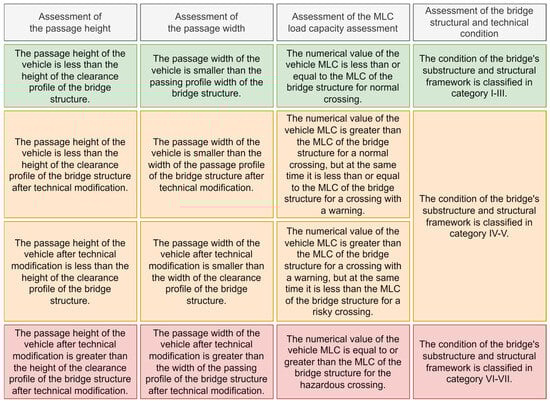 The assessed parameters are the clearance height, clearance width, MLC value, and the construction-technical condition of the bridge. Based on the results of the comparison, the infrastructure object is classified into three categories according to its suitability for the selected type of transport: