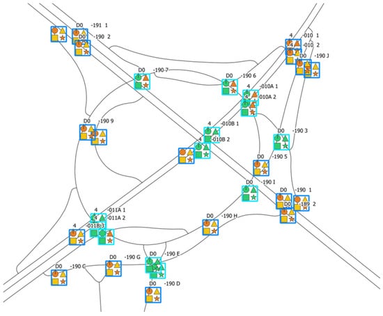The digitalization of critical TEN-T land infrastructure objects also plays a key role in the planning of strategic military transport. The analysis within this process focuses on the ability of bridges, tunnels, and underpasses to meet the requirements of military transport, which is essential for crisis scenarios and ensuring the smooth passage of excessive or oversized transports. The digitalization includes the evaluation of the load-bearing capacity of bridges and the clear heights of underpasses and tunnels in order to determine their passability. Bridges were divided into four transport modes: normal, warning, risk and exceptional load exceeded. Two modes were defined for tunnels and underpasses—pass and warning. Thanks to this categorisation, it was possible to create a clear model of the transport network, which provides key information for planning military movements and allows for the effective identification of critical sections that require reconstruction or other measures. An example of the digitalization of the results of the assessment of the suitability of Exit 10 of the D0 motorway (outer Prague ring road) for selected vehicles/trains is demonstrated in Figure 10.