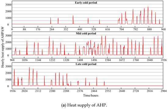 The design optimization results for both systems are shown in Table 3. The results show that the additional heat pump capacity required to fill the same heating shortfall is 3150 kW for the VCSHS, which is 200 kW larger than that for the ASHS (2950 kW). However, the latter has a larger capacity of the thermal storage device. In addition, the results of the operational optimization of the two systems are shown in Figure 8 and Figure 9.