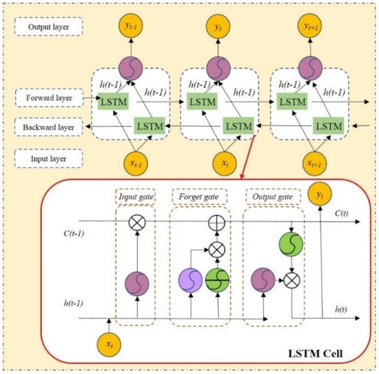 The model’s hidden layer state at time step t accumulates information from , , …, , and . At each time step, when new information is input, the state vector is updated. The original LSTM captures time features in a unidirectional manner, whereby the information at the current time step is only dependent on the preceding time steps (, , …), and not on the subsequent ones (, , …).