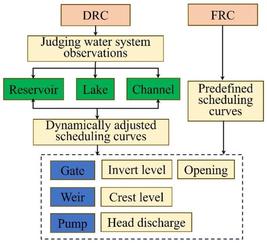 WEJC regulates river water levels by adjusting the discharge from reservoirs, embankments, or sluice gates in response to the system’s real-time conditions. It involves altering the degree of opening of reservoirs or sluice gates to manage and control water levels and flows in the channels. WEJC consists of two components: the configuration of scheduling schemes and the computation of flow rates for various hydraulic structures. This study constructs two distinct scheduling strategies based on the PBM. Strategy A employs fixed rule-based control (FRC), wherein scheduling curves for water engineering are pre-established before rainfall events. These predetermined curves guide the operation of water engineering systems during intense rainstorms. Conversely, Strategy B adopts dynamic rule-based control (DRC), which adjusts in response to changing conditions within the water system. The scheduling rules are formulated based on the prevailing water system and the inflow rates. DRC adapts to variables in the water system, offering a more optimized real-time control approach. Figure 4 presents the basic process of scheduling.