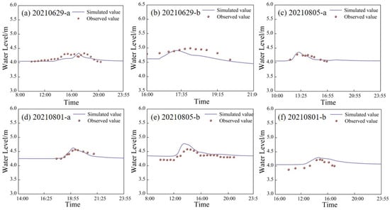 Calibration and validation periods of PBM: (a) Calibration period (20210629) of junction of Fengban and Jin’an River. (b) Calibration period (20210629) of junction of Qinting Lake and Jin’an River. (c) Calibration period (20210805) of junction of Wusi zone and Jin’an River. (d) Calibration period (20210801) of Jin’an and Dongjiao River. (e) Validation period (20210805) of junction of Qinting Lake and Jin’an River. (f) Validation period (20210801) of junction of Jin’an and Guangming River.