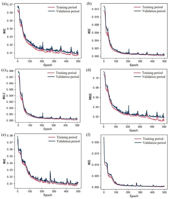 The variation in model errors for the WS station and GMG station water level prediction model during the training and validation periods is illustrated in Figure 8. After 500 training iterations employing the gradient descent algorithm, the model’s metrics exhibited a decreasing trend. At this stage, the model reached a reasonable level of convergence. While certain metrics, such as RMSE, might have still had potential for further reduction on the training dataset, they had already stabilized on the validation dataset. It is worth noting that excessively high metrics on the training dataset could indicate overfitting. In the test dataset, the model achieved the following performance metrics: the MSE was 0.001, the MAE was 0.012, the MSLE was 0.0007, and the RMSE was 0.033. Employing the gradient descent algorithm over 500 training iterations, the model’s metrics exhibited a fluctuating descent pattern. Throughout the iterative process, the reduction in loss for both the validation and training phases closely corresponded. In the test dataset, the model achieved the following performance metrics: the MSE was 0.001, the MAE was 0.014, the MSLE was 0.0006, and the RMSE was 0.031.