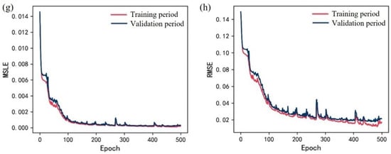Error change during training period and validation period: (a) MAE of WS; (b) MSE of WS; (c) MSLE of WS; (d) RMSE of WS; (e) MAE of GMG; (f) MSE of GMG; (g) MSLE of GMG; (h) RMSE of GMG.