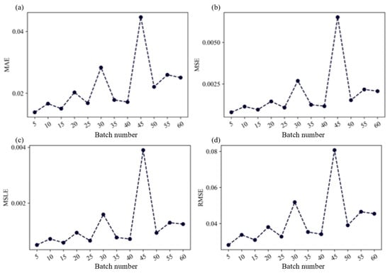 The hidden layer number (HLN) indicates the quantity of nodes employed to represent the hidden state within the model. Specifically, within the model, the current state is conveyed to the previous time step through forward connections. The parameter HLN is employed to signify the quantity of nodes used for retaining and storing past states. Figure 9 graphically illustrates the impact of the parameter HLN on four evaluation metrics (MAE, MSE, MSLE, and RMSE) when varied across a range from 10 to 150.
