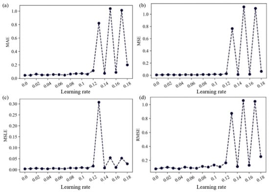 Response of model performance to HLN: (a) MAE; (b) MSE; (c) MSLE; (d) RMSE.