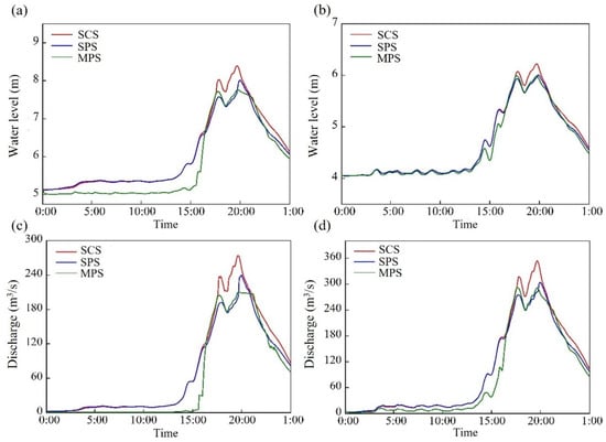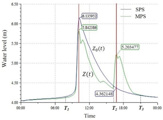 where represents the water level under SCS; t is time; and is a small value. As shown in Figure 13, the water level at the monitoring site reaches its peak around 10:10, with a maximum value of approximately 6.14 m under SCS. When MPS is introduced, the peak water level decreases to around 5.84 m. During the subsequent period, the water level remains relatively low. The retained floodwater forms a local maximum at approximately 16:30, but this peak is significantly lower than the previous one.