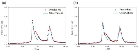 Figure 14 presents the simulation results after incorporating scheduling information, showing Sample 13 and Sample 32 from the test set. The simulated values for Sample 13 closely match the observed values, with a maximum simulated water level of 5.28 m and a maximum observed water level of 5.20 m. The largest deviation occurs between 10:30 and 13:00, while the two curves remain largely consistent at other times. Similarly, for Sample 32, the simulated values align well with the observations, with a maximum simulated water level of 5.15 m and a maximum observed water level of 5.19 m. The most significant deviation is observed between 11:00 and 16:30, while the water levels remain consistent during other periods. After encoding the scheduling information, the water level process exhibits a “double-peak” pattern, with the first peak significantly lower compared to the peak under non-scheduling conditions. The A-LSTM model effectively captures the overall trend of flood wave propagation, but its ability to extract features of local variations with large fluctuations is relatively weaker. This limitation is partly due to the scale of the dataset and the insufficiency of information. With the introduction of scheduling rules, external influences such as water engineering regulation cause localized fluctuations at the WS station. The limited number of data samples and training epochs restrict the model’s ability to fully learn and generalize local response characteristics over specific time intervals.