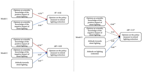 Results of hierarchical multiple regression analysis for opinions and attitudes on the policy measure to extend lighting extinction measure at each stage of analysis. Blue arrows represent positive relationships. Red arrows represent negative relationships. Black dashed arrows represent non-significant relationships. * p < 0.05. *** p < 0.001.