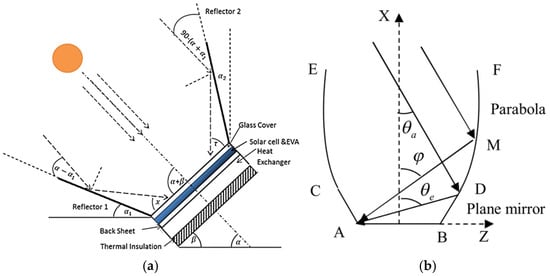 Reflective LCPV design: (a) V-trough LCPV [17] and (b) Compound Parabolic LCPV [18].