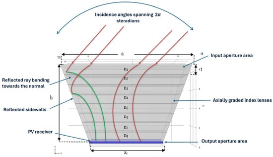 For the pyramidal concentrator, the design is characterized by a tilt angle of 71° and a height of 31.64 mm (see Figure 13). The results show a geometrical concentration ratio of 9.37× and an optical concentration ratio of 4.63 suns. The optical efficiency was found to be 49.41%, and the absolute mean relative error compared to [32] was around 1.57%.