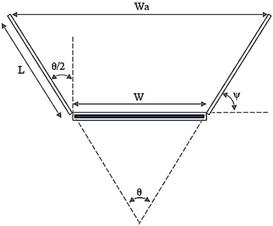 where L is the reflector length, W is the width of the PV panel, and ϴ is the reflector tilt angle. A simple scheme of a V-trough concentrator is shown in Figure 5.