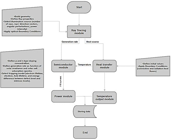 The Finite-Element Method (FEM) is applied to solve Poisson’s equation based on semiconductor physics. In addition, optical ray tracing is coupled to the semiconductor module by applying the direct spectral irradiance for different wavelengths, and the photo-generation rate equation is used to estimate the current–voltage curve (I-V curve) and the power–voltage (P-V curve) features, considering the temperature of the models that will affect the photoelectric voltage.