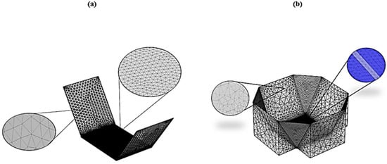 The size of the generated mesh is one of the most challenging criteria for global and convergent numerical solutions. This is because the mesh size can affect the accuracy of the numerical outcomes and the required computational time of the developed models. COMSOL software uses one of the best numerical techniques for computing and solving the mesh density analysis. The numerical schemes are based on Finite Element Analysis (FEA). Figure 7 illustrates the generated mesh of the V-trough and EDV concentrators. Different mesh qualities are represented by different colors in Figure 7b.