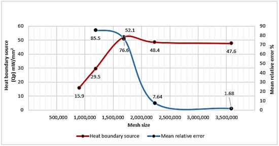 where and are, respectively, the heat boundary source within the cell domain for the jth mesh size and its closed predecessor jth − 1 mesh. Figure 8 displays the trending variation in the heat boundary source and the relative mean error versus the receiver mesh size. As shown in Figure 8, as the number of mesh elements increases, starting from the coarser (693,367 elements) to the customized extra-fine grid size (4783.895), the relative mean error decreases till it reaches the minimum value of 1.68%, at which point the numerical model is judged as converged.