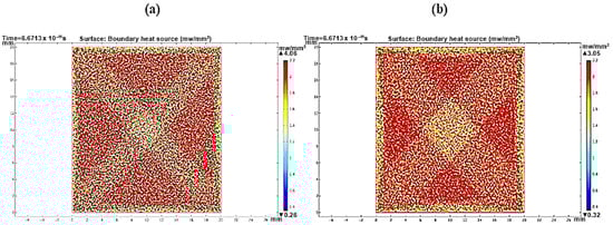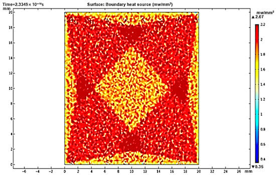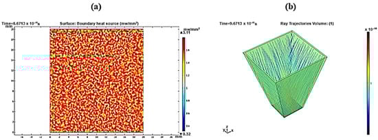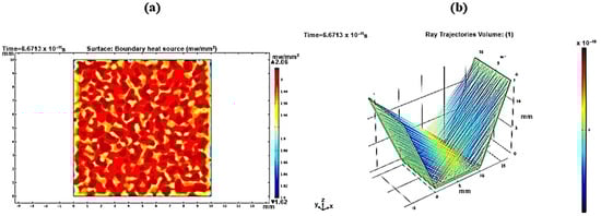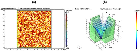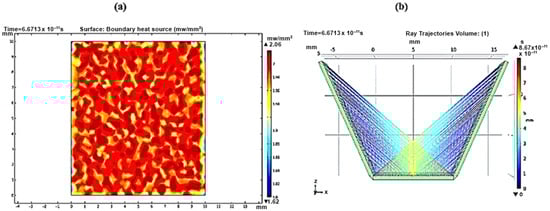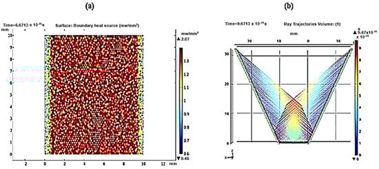 For a reflector length of 35 mm, Figure 9a shows a maximum heat boundary source (focused rays’ power intensity) of 2.07 mW/mm2, while the ray path pattern shows overlapped reflected rays (Figure 9b). Therefore, the extra length of the reflector will cost more without an effective contribution to the concentrated solar densities. Using Equation (3), the useful length of the reflector was determined. After the truncation of 19.79 mm from the reflector length, the new reflector has a useful length of only 15.21 mm. As shown in Figure 10a, the obtained heat boundary increased to become 2.08 mW/mm2, and the rays were more uniformly integrated over the receiver, as shown in Figure 10b. The same approach was considered and applied to find out the useful length at different tilt angles.