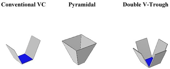 (a) Conventional, (b) double V-trough, (c) pyramidal, and (d) Enhanced V-trough.
