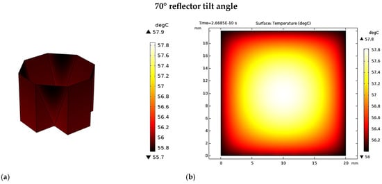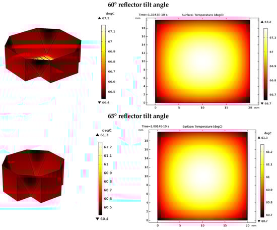 In this section, the reflector’s absorptivity is assumed to be ideal. As shown in Table 5, the optical concentration ratios at reflector tilt angles of 60°, 65°, and 70° are 3.21 suns, 3.86 suns, and 4.66 suns, respectively. The tilt angle of 70° yields the highest optical concentration ratios and optical efficiencies.