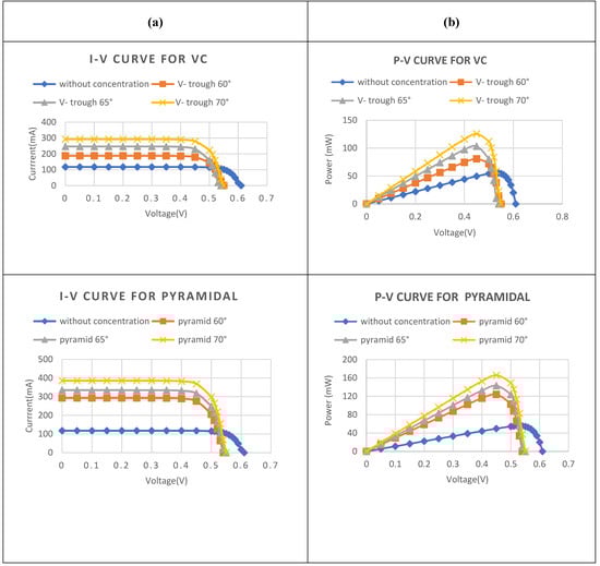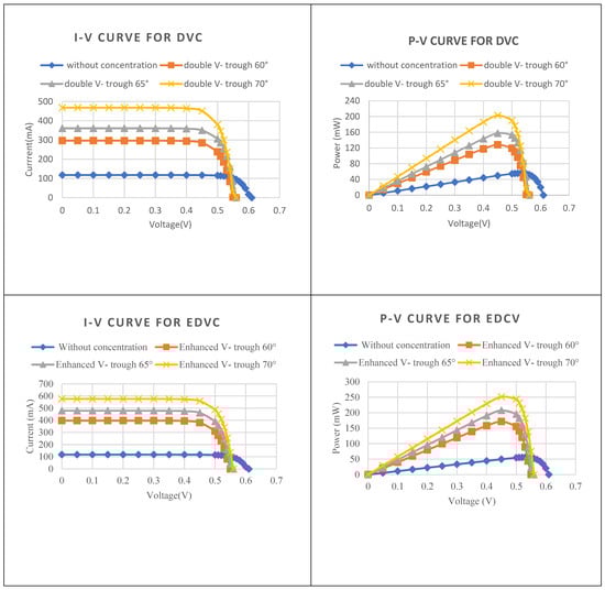 Figure 20 demonstrates the I-V and the P-V curves of the PV cell without concentration, and with the conventional V-trough concentrator (CVC), pyramidal, double V-trough (DVC), and the Enhanced Double V-trough Concentrator (EDVC) at different reflector tilt angles (60–70°). A tilt angle of 70° yields the maximum photoelectric current due to the increase in the aperture area. The short-circuit current of the m-Si solar cell without concentration reaches 118 mA, with an open-circuit voltage of 0.61 V. Implementing the CVC, pyramidal, DVC, and the EDVC at a tilt angle of 70°, the maximum short-circuit current increases to 292.4 mA, 385.9 mA, 467.88 mA, and 576 mA, respectively. The short-circuit current of the EDVC at 70° is almost five times that of the one without concentration. In addition, the maximum power of the CVC, pyramidal, DVC, and EDVC at 70° is 125.5 mW, 166 mW, 202.7 mW, and 251.5 mW, respectively. The voltage drops between the cell with and without concentration do not exceed 11%, due to the increase in the temperature of the modules.