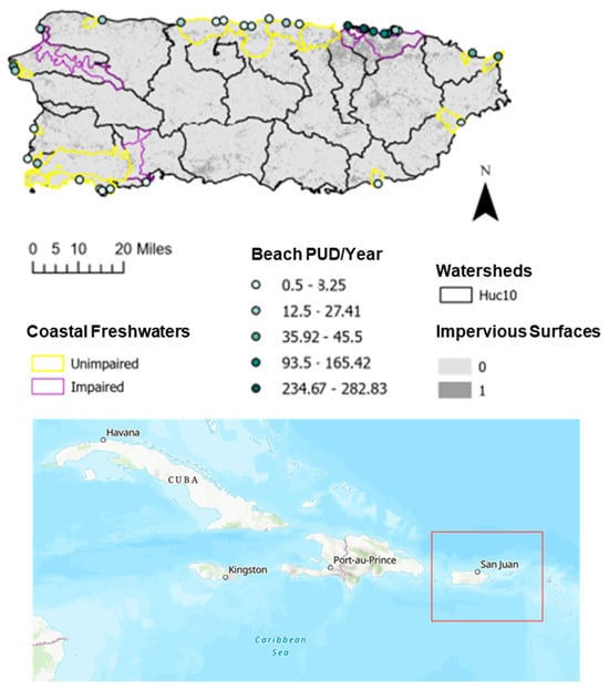 - Puerto Rico GIS. Balnearios 2016. 2016. Available online: https://gis.pr.gov/descargaGeodatos/Dotaciones/Pages/Recreaci%C3%B3n.aspx (accessed on 11 January 2025).