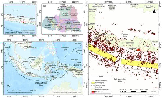 Study area, geology, and the existence of seismic gap (sources: [7,8,9]). (a) The study area is located on Java Island, highlighting the boundary between the Eurasian Plate and the Indo-Australian Plate in the southern part of the island, (b) the detail of geological formation in the study area, (c) the study area is situated within the country’s setting, emphasising the interaction between tectonic plates, (d) the study area and the seismic gap location.