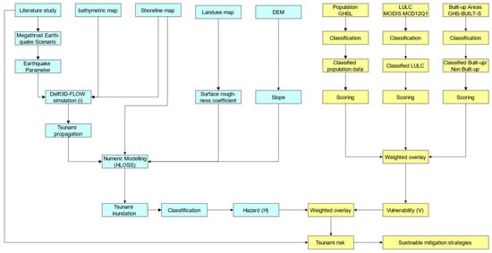 The general risk function was used for assessing tsunami risk levels in the research area, which is a common approach in disaster risk management (Equation (2)) [31,32]. The risk is computed in this method by a cross-section of hazard and vulnerability. This approach stems from the studies [33,34] that consolidated these two variables. Here, the multiplication of hazard and vulnerability factors is used to define the risk.