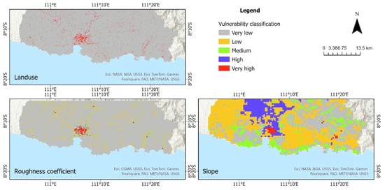 The vulnerability analysis for estimating tsunami risk was conducted using three key datasets: population data, land use/land cover, and built-up areas. The population data were derived from the Global Human Settlement Layer (GHSL) that provides global population data for the period of 1975–2023, known as the Global Population Surfaces 1975–2023 (P2023A) dataset, which captures all necessary information of populations. The land use and land cover data were taken from the MCD12Q1.061 MODIS Land Cover Type Yearly Global 500 m dataset, determining a region’s vulnerability to certain potential threats. Eventually, the urbanised areas were appraised by the GHS-BUILT-S R2023A-GHS built-up surface grid, data that provide information on the distribution of the building footprint. All parameters (Figure 4) were combined using the weighted overlay, with the score and weight presented in Table 2.