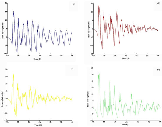 Tsunami height monitoring in four stations. (a) Pacitan Bay, (b) Soge beach, (c) Taman beach, (d) Watukarung beach.