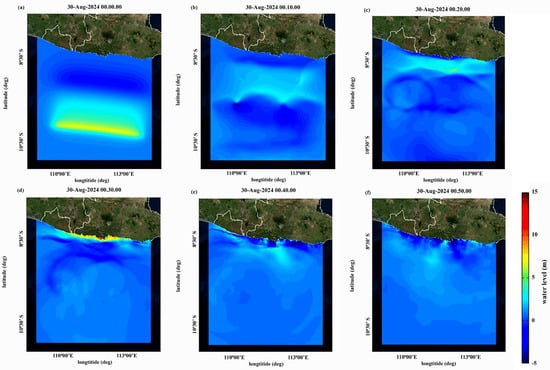 In Pacitan Bay, the model’s point monitoring reports have indicated that the initial amplitude of tsunami waves was simulated to be −4.31 m at 0:27 min post-earthquake, with the first wave reaching a height of 15.3 m at 0:34 min. The second minimum amplitude wave attained −9.25 m at 0:54, while the second wave achieved a height of 11.18 m at 1:02. Before the sixth wave, the tsunami height attained 8 to 10 m. The bay’s indentation configuration focused wave energy, hence intensifying the tsunami’s impact in this region.