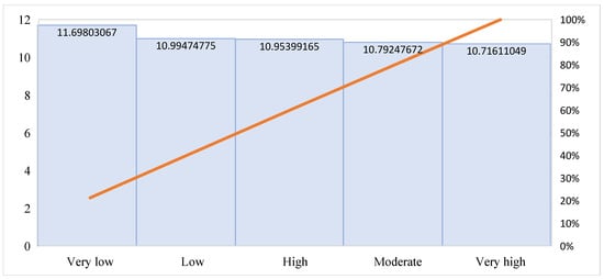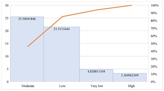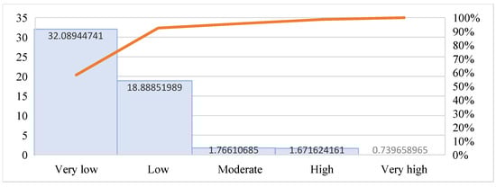 The results of the tsunami risk analysis indicate disparities in the risk distribution within the research area (Figure 11 and Figure 12). According to the risk categorisation, 21.52 km2 of the entire area is classified as low risk, and 4.84 km2 is designated as extremely low risk. This signifies that almost one-third of the region exhibits negligible tsunami danger, indicating comparatively lower susceptibility levels than other places. The medium-risk area encompasses 25.51 km2, showing a heightened threat to infrastructure and population. Furthermore, the high-risk zone encompasses 3.31 km2, which necessitates focused attention on mitigation and preparedness plans [35].
